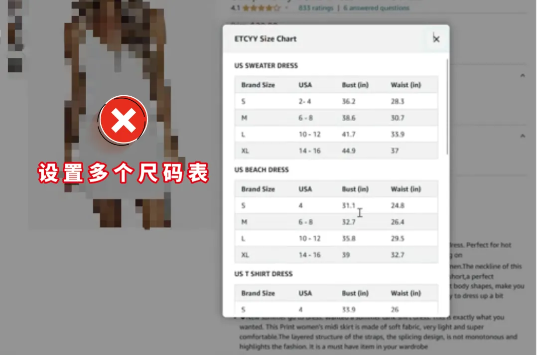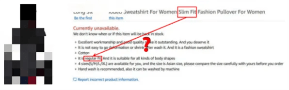 当消费者在同一个商品的下拉尺码表、尺码表图片、A+页面、产品详情中看到了不一样尺码信息时,将造成他们的购物困扰,也可能会导致后续退货的发生。