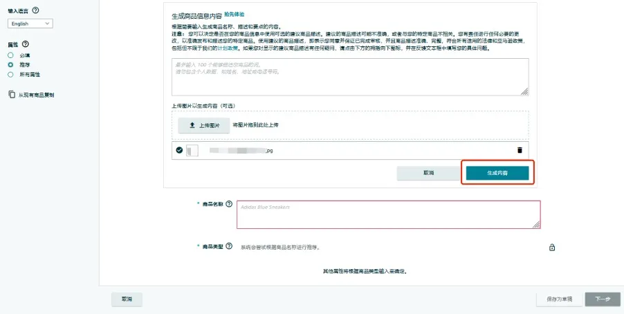 如上图所示,AI 会自动预填商品名称、产品描述、五点描述、产品属性等内容,其余信息如关键词、型号名称、制造商等信息需手动填写。