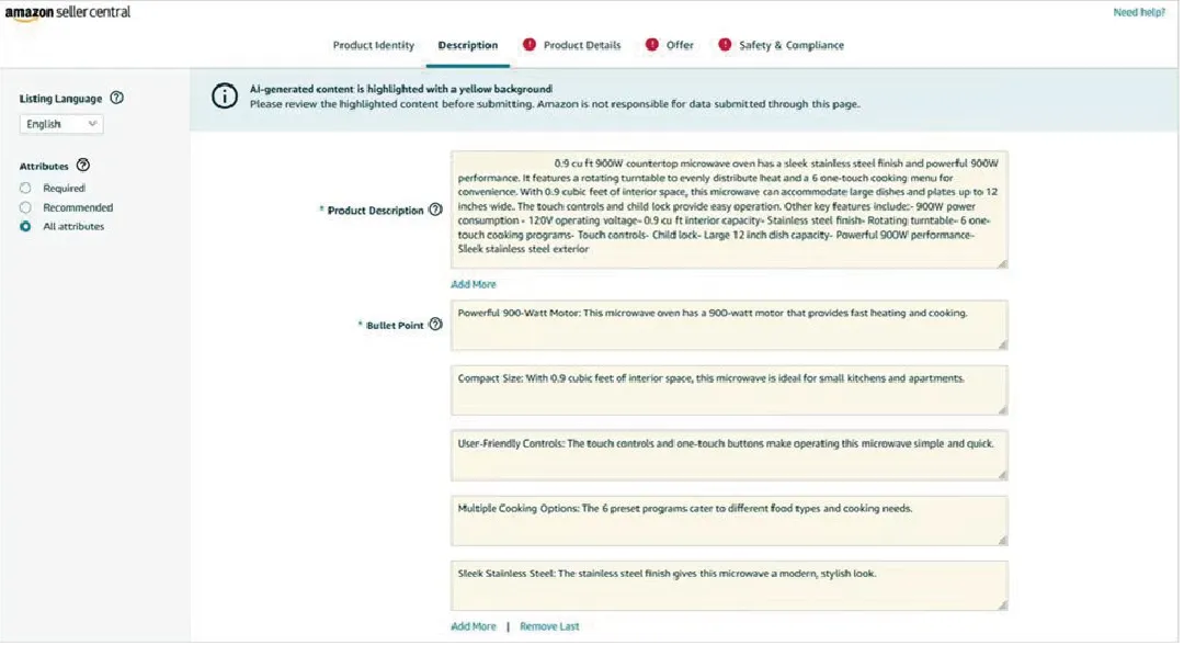 🏷️ 在发布之前,卖家必须严格审查生成的内容。因为生成式 AI 的内容可能包含原始输入中不存在的信息和描述。卖家必须检查并且确保内容准确和合规。