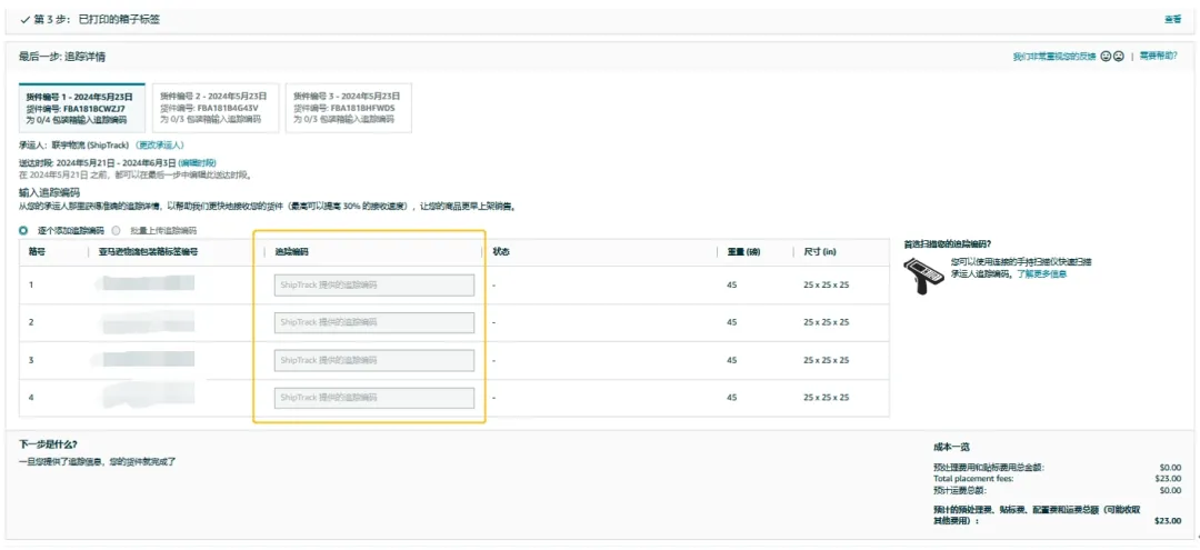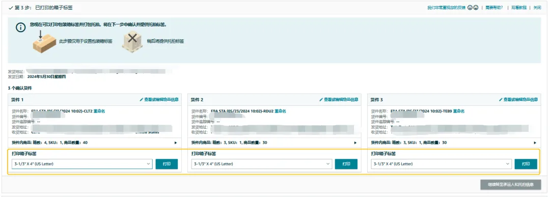 在这一步可点击【打印】,为每个箱子打印FBA箱号标签并正确贴上。将箱子交给承运人后,请记录承运人追踪编码(下一步需提供)。如果选择Amazon SEND(亚马逊跨境承运伙伴方案)或ShipTrack承运人,则无需提供追踪编码。