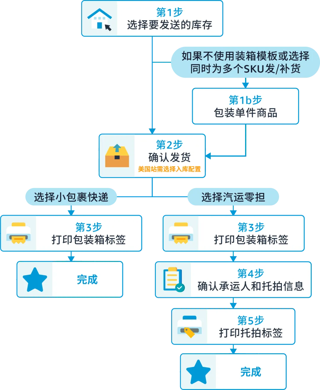 根据所在的站点及创建货件时所做的选择,卖家看到的步骤可能有所不同,大致步骤如下: