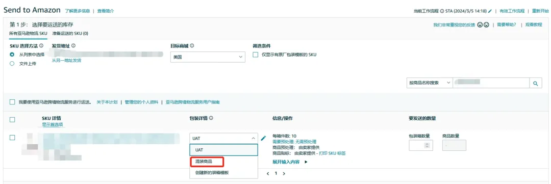 ①从【包装详情】下拉菜单中为要处理的 SKU选择【混装商品】。