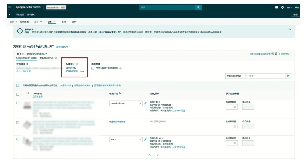 通过卖家平台进入AWD创建货件页面,在选择要运送的库存时,点击“更改配送地址”;