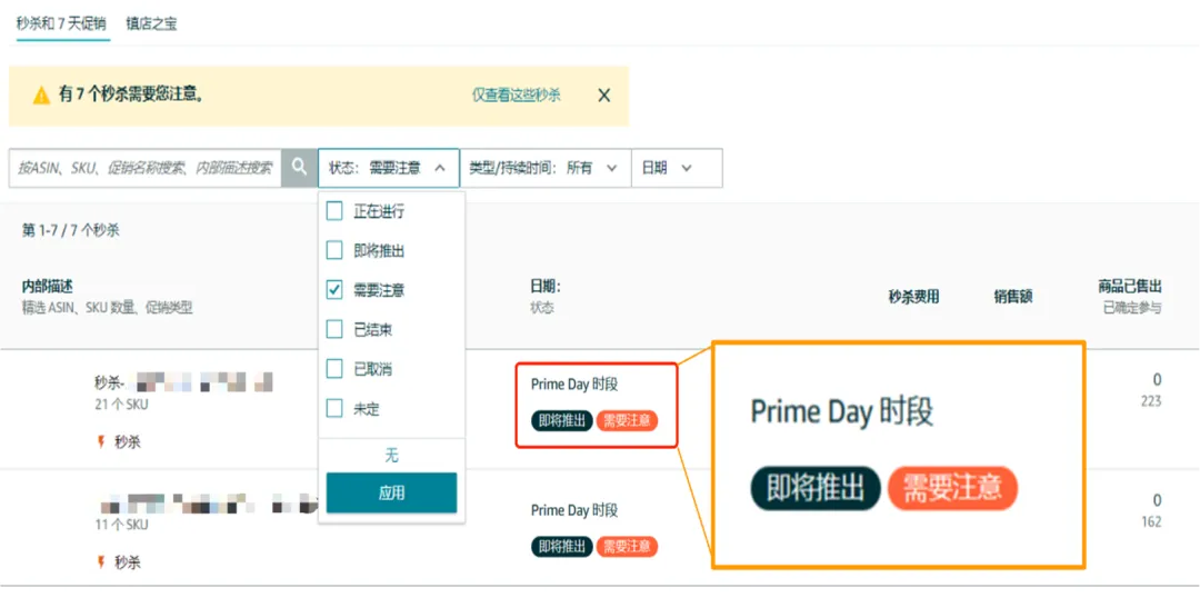 🔍 查看路径:卖家平台 -> 促销 -> 筛选出状态为“需要注意”的Deal活动