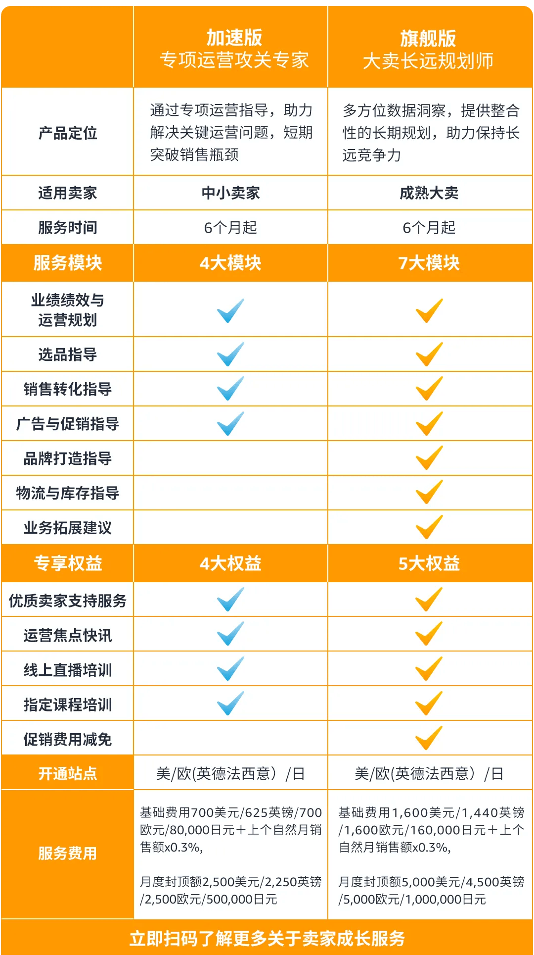 亚马逊卖家成长服务,精准解决痛点,提升运营效率,助力销售增长。无论您是新手还是老手,这项服务都是您在亚马逊成功路上的得力助手!2个版本供不同阶段卖家选择: