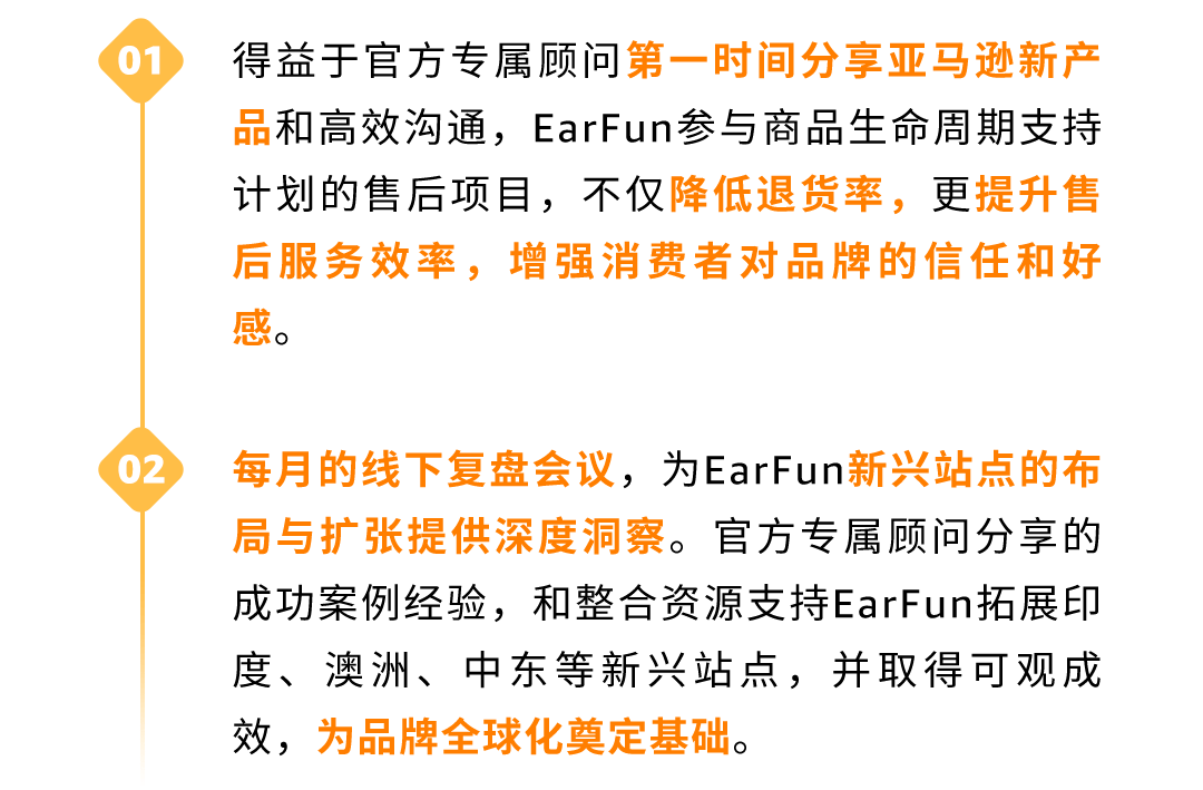 加入亚马逊“卖家成长服务”后,官方专属顾问还会为EarFun第一时间精准解读亚马逊最新政策、分享一手产品发布资讯,以及新兴站点的机会点,帮助卖家时刻掌握行业脉搏,紧跟亚马逊的趋势和政策,不仅规避风险,更抢先把握商机!