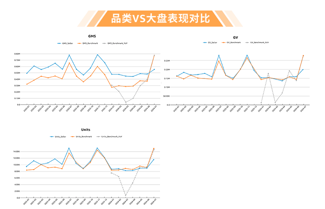 **请注意:大盘的TK只展示变化趋势,Y轴的数值为卖家的TK数据,非大盘的TK数据;Benchmark_YoY为对应指标在大盘的YoY变化趋势