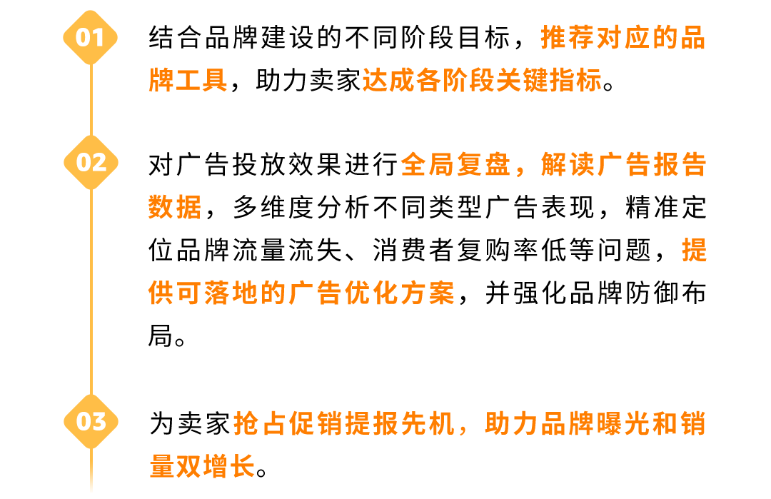 有了优质商品作为成功基础,下一步就是品牌营销。官方专属顾问提供以下指导,协助卖家运用品牌工具、制定广告促销策略,实现站内外有效引流,全面提升品牌知名度、提升销量。
