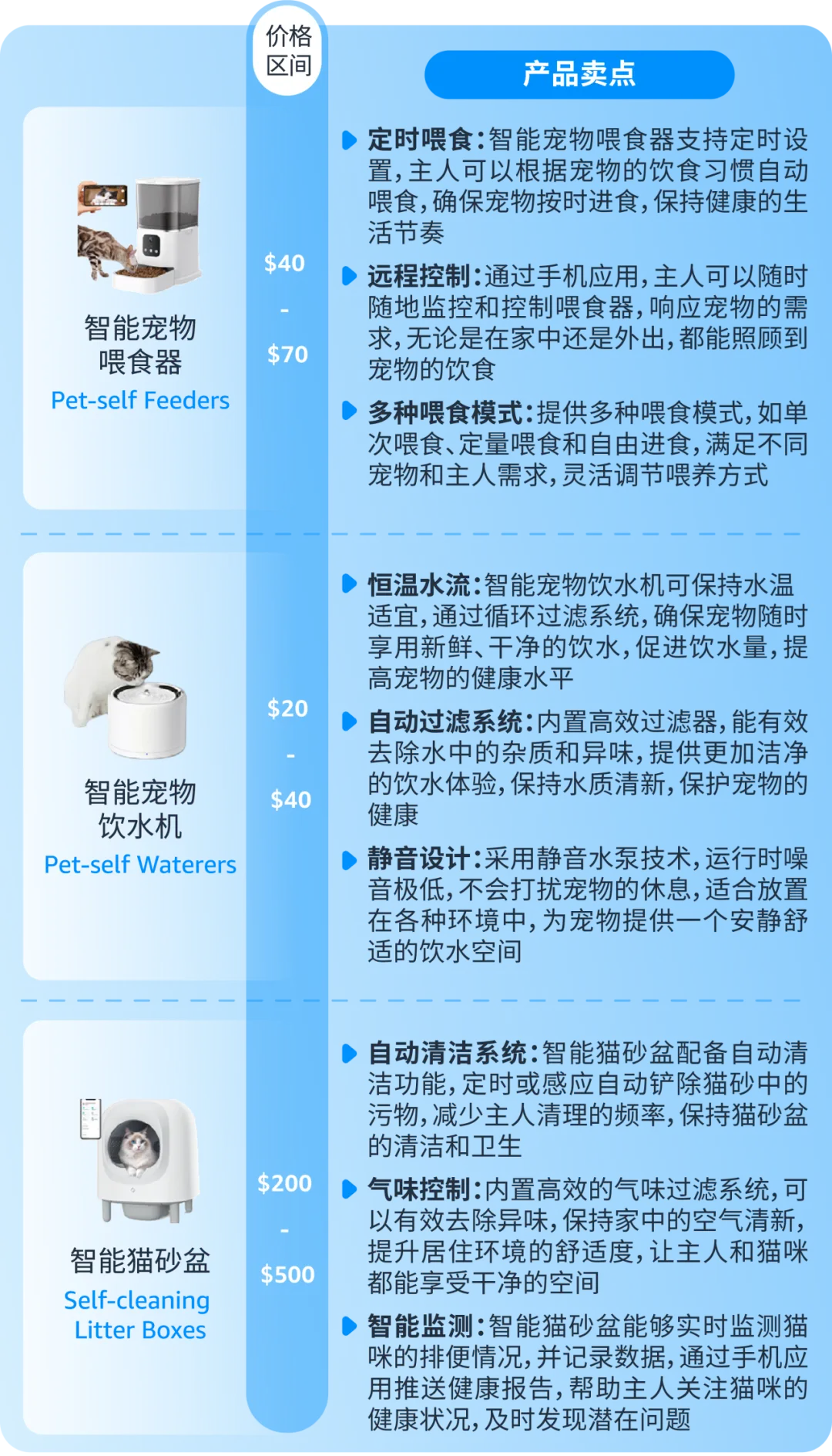 本次《亚马逊生活百货品类攻略手册》除了细致的趋势分析和丰富的热门选品推荐外,还为您准备了详尽的产品卖点解析,以智能宠物产品为例,先来一睹为快吧!