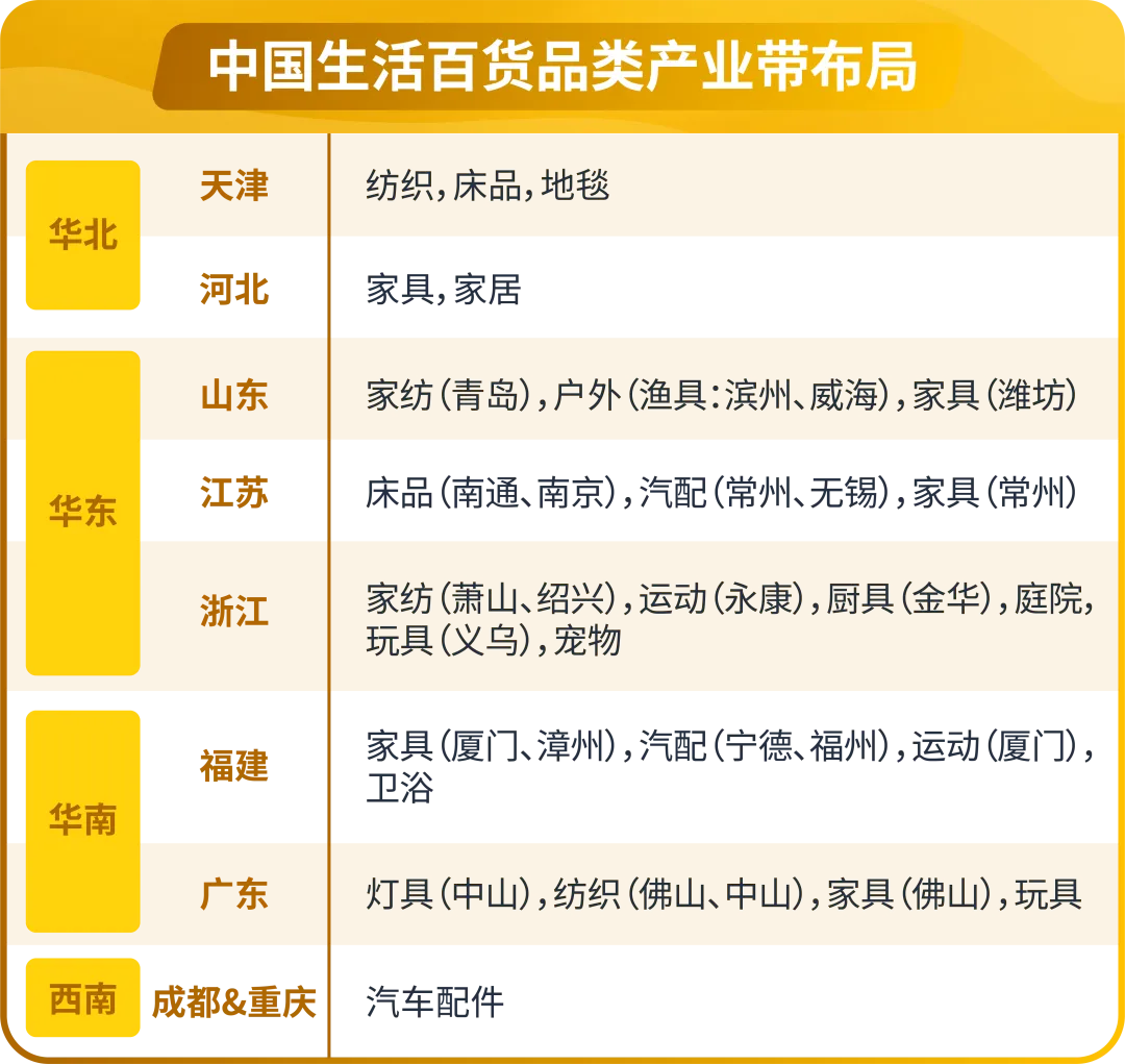 您可通过下方表格查看中国生活百货品类产业带的具体分布,还可结合实操案例,借官方助力,逐个击破出海痛点!