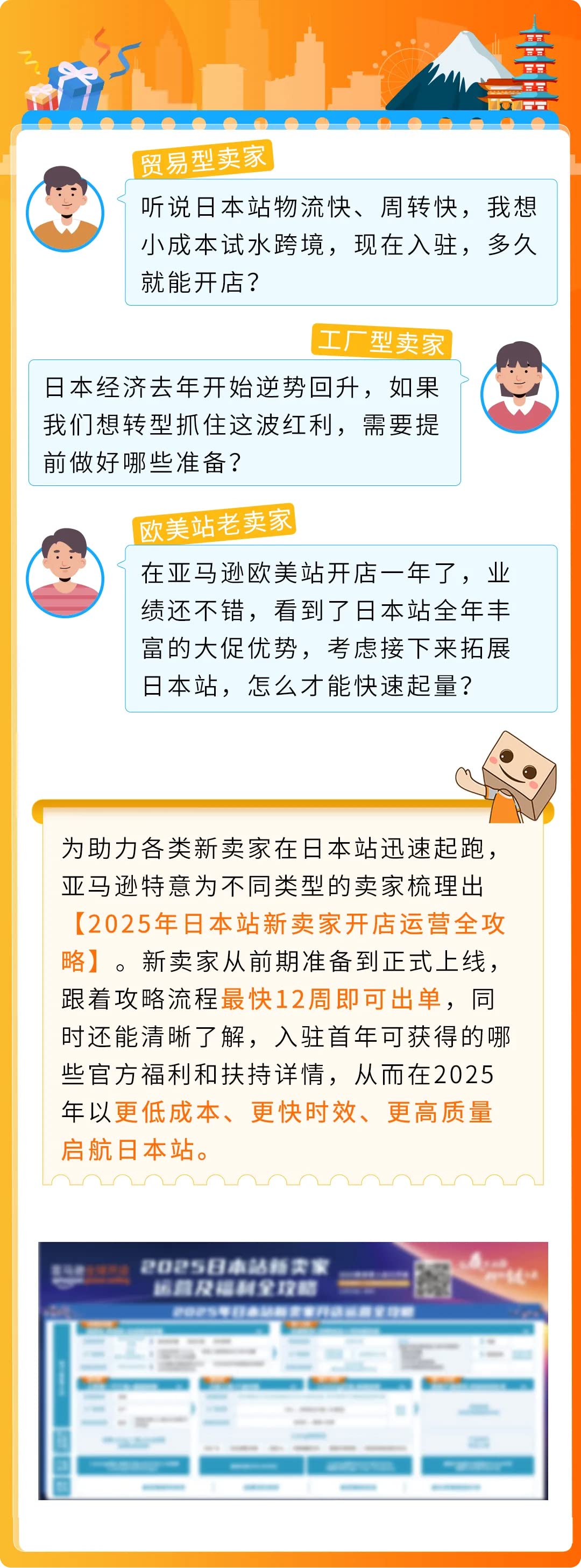 【2025年日本站新卖家开店运营全攻略】不仅可以助力各类新卖家快速、稳步上线日本站,同时还帮卖家总结、罗列出各阶段的福利详情,让各位新卖家不仅开店有人帮,还可入驻就有羊毛“薅”!
