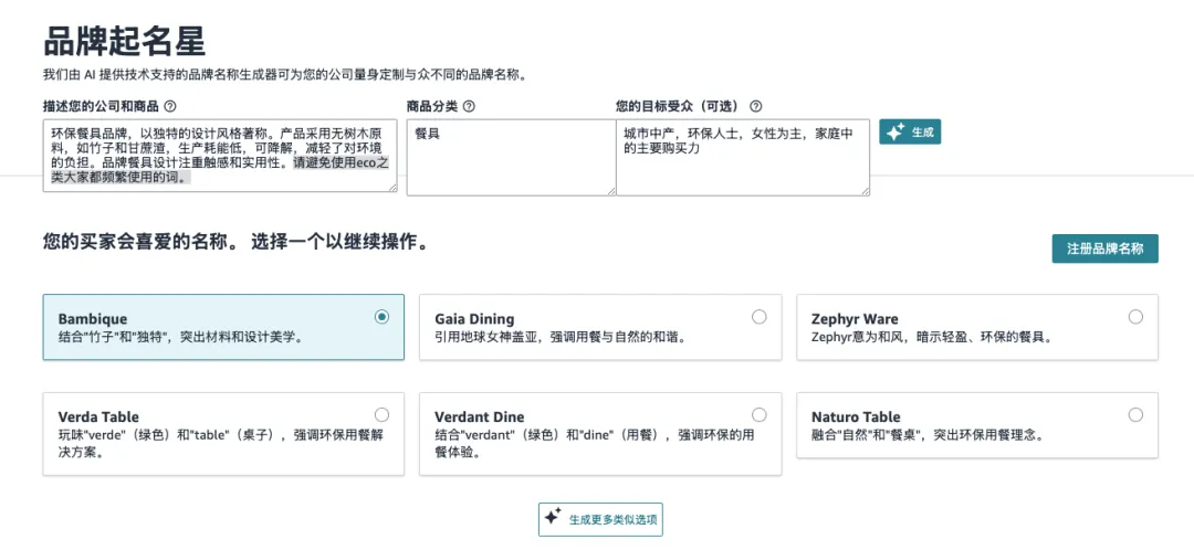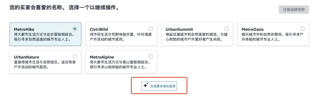 「亚马逊品牌起名星」首次可生成6个创意品牌名,如果您对生成的品牌名不满意,或者希望获取更多起名灵感,可点击“生成更多类似选项”,不限次数不限数量生成品牌名。