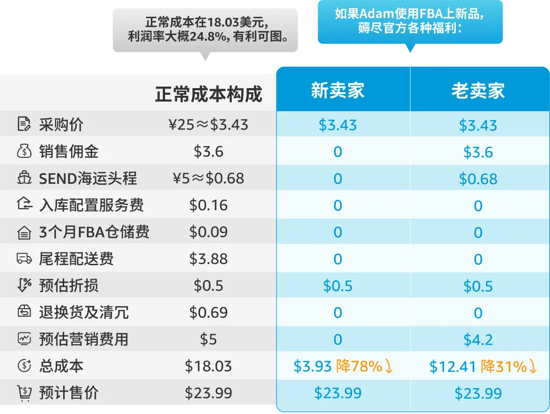作为新卖家,Adam测新品成本直降61.6%,而经营到第二年的上新成本也可以降低31%~