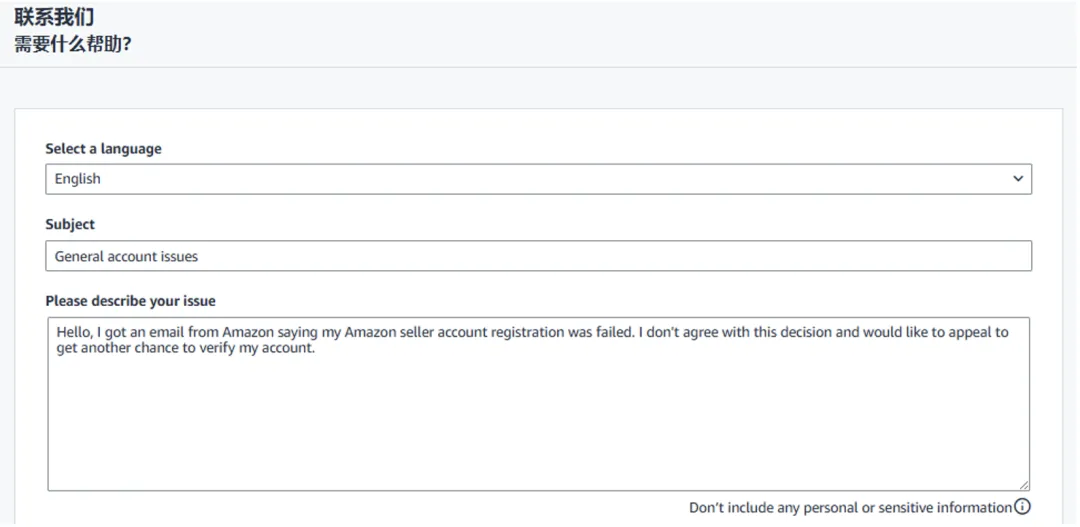 📖比如:“Hello, I got an email from Amazon saying my Amazon seller account registration was failed. I don't agree with this decision and would like to appeal to get another chance to verify my account. ”