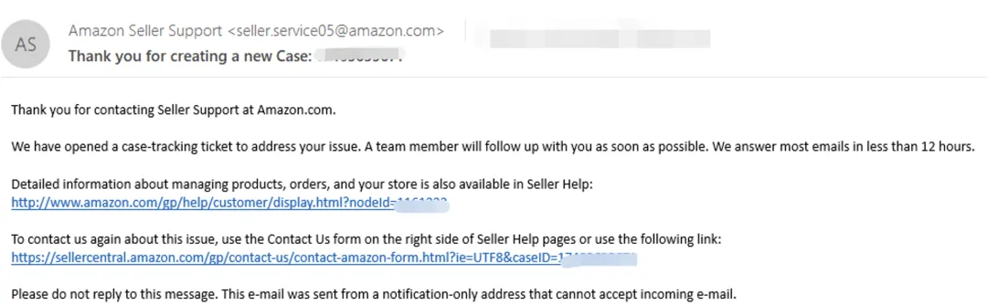 ● 在您成功发送申诉请求之后,您会收到一封来自亚马逊的邮件,通知您已经创建了一个新的案例(Case)。后续您可以重新登录此页面或者检查您的邮箱查看是否收到来自“卖家支持”团队的回复。