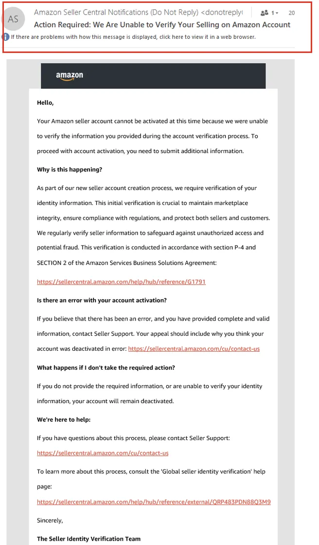 在您提交资质审核之后,如收到如下标题及内容的邮件:邮件标题为📮《需操作:我们无法验证您的“我要开店”账户》/《Action Required: We Are Unable to Verify Your Selling on Amazon Account》,则表示您的资质审核未通过。请注意邮件后缀为@amazon.com, 谨防钓鱼邮件。