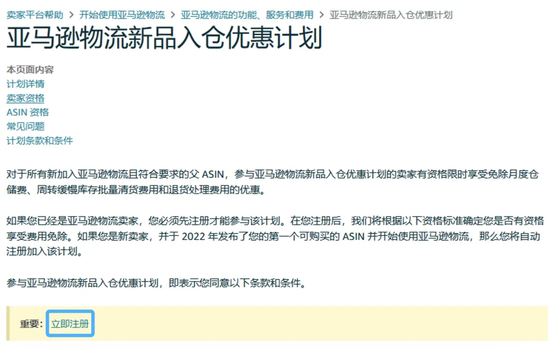 ② 访问卖家平台“亚马逊物流新品入仓优惠计划”帮助页面,点击页面中的“立即注册”加入该计划