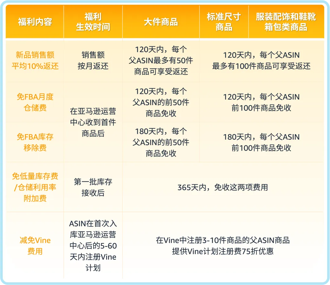 首次使用FBA后,卖家可以获得“新品入仓优惠计划”,新品平均10%返还,免FBA月度仓储费、低量库存费、仓储利用率附加费、库存移除费,以及Vine 25%折扣。