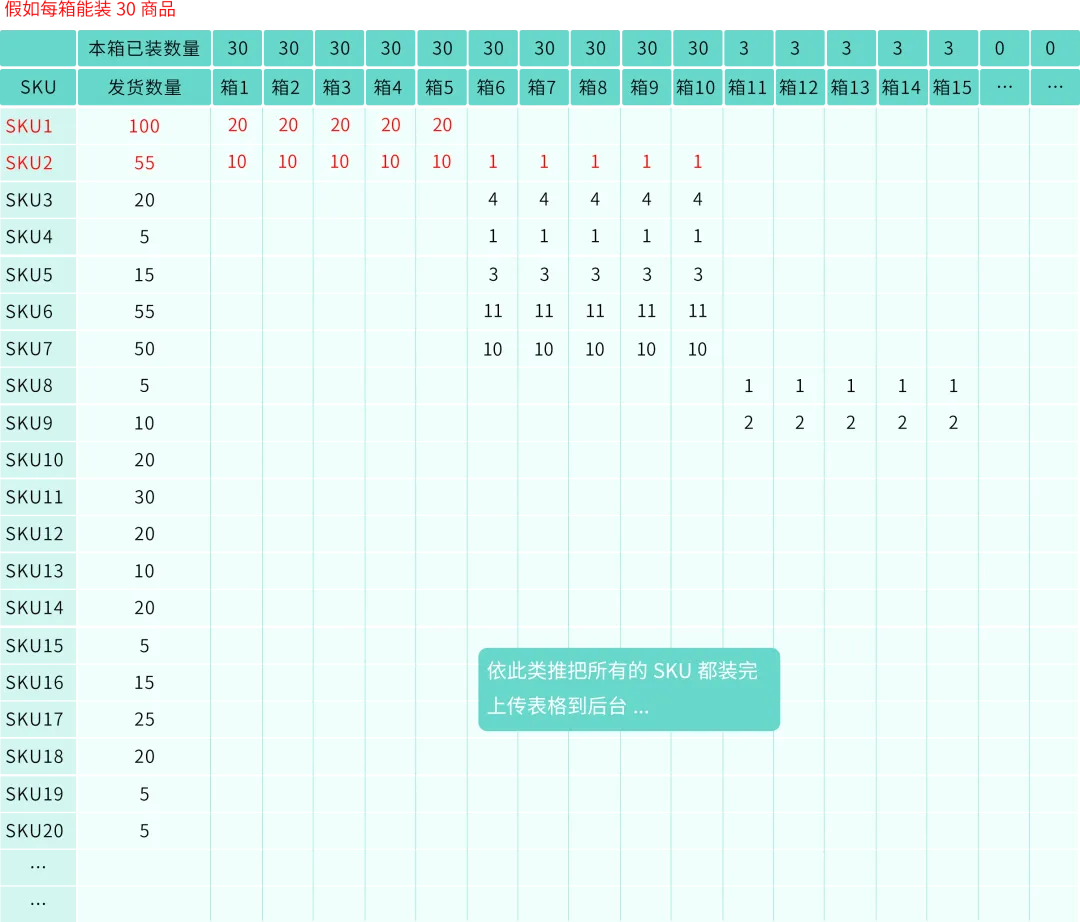 ● 同SKU均分:同一SKU分5箱,每箱数量必须相同