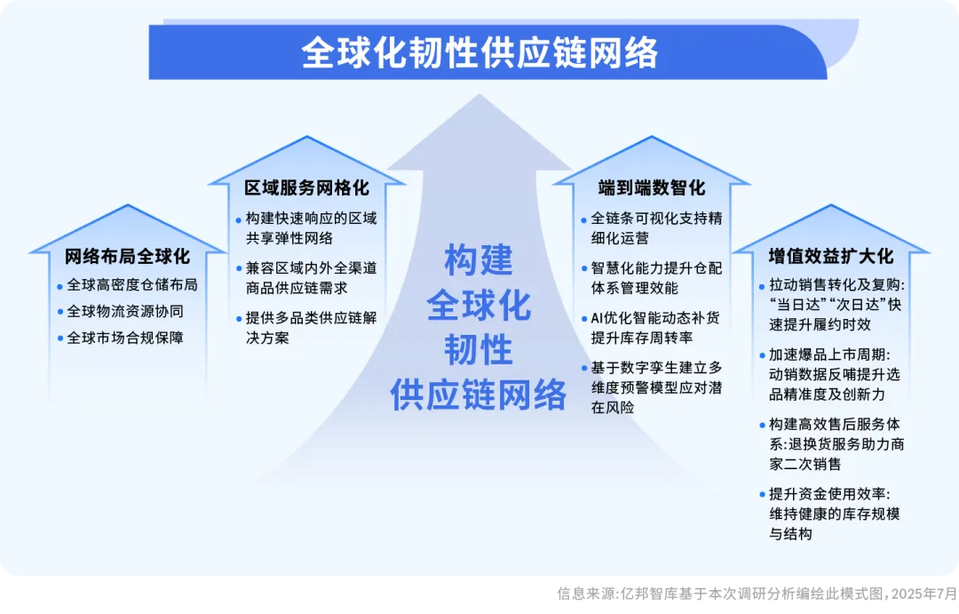 融合行业洞察与一线商家调研,《报告》提出“全球化供应链韧性网络”创新模式,为出海商家在全球贸易格局复杂多变环境下破局突围,提供从战略布局到落地执行的全维度解决方案。