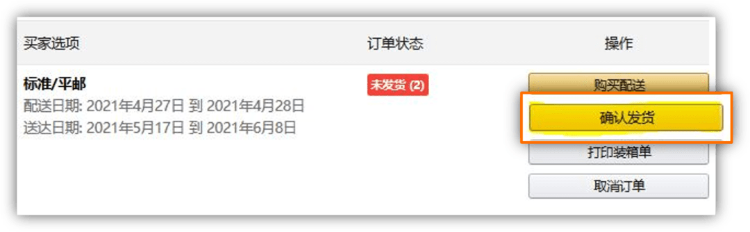 将商品交给物流承运商后,您需要在卖家平台完成确认发货(“Confirm Shipment”)