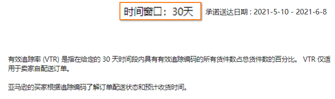 亚马逊将基于给定的过去30天(预计送达日期)滚动周期,基于自配送订单下的各个商品分类,来测量得出卖家所有分类的有效追踪率。
