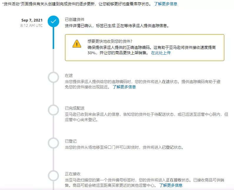您可以通过卖家平台标准化货件创建流程、货件一览页面上的追踪货件选项卡,以及亚马逊商城网络服务向亚马逊提供追踪信息。