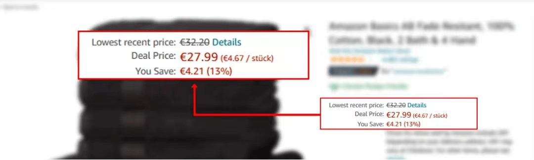 因此,亚马逊欧洲站(除英国站外)的商品已经(或将会)显示过去30天该商品在亚马逊商城的最低价,标记为“近期最低价(Lowest recent price)” ,如下图所示。鲜明的价格对比会增加视觉冲击力,也能让您的商品更具竞争力和吸引力。
