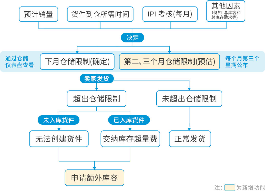 简化体验,合并补货限制和仓储限制,采用单一的亚马逊物流仓储额度,每种存储类型的单一限制将决定卖家可以发送并存储到亚马逊运营中心的库存量。