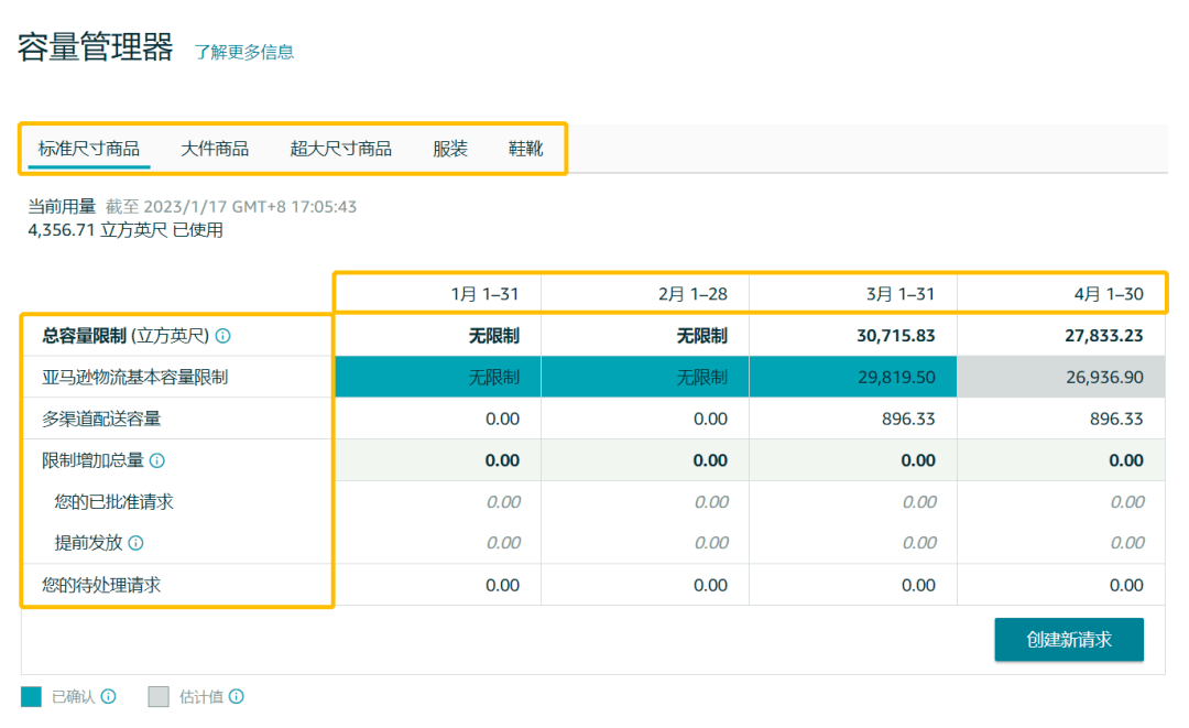 除了下个月已确定的仓储容量外,亚马逊还将提供接下来两个月的预估仓储容量。此外,卖家可以按库存状态、库容来源(初始容量或申请的额外容量)细分库容类型。