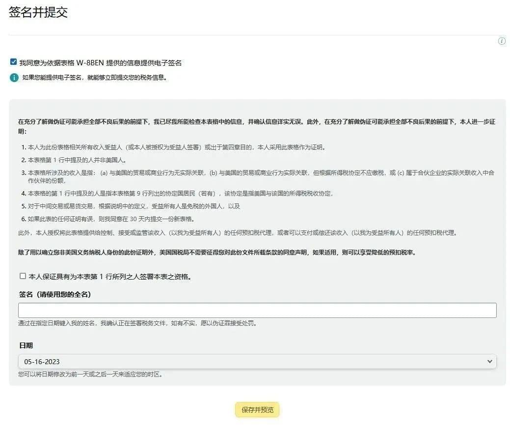 点击“继续”,提供电子签名并提交以供亚马逊完成验证。