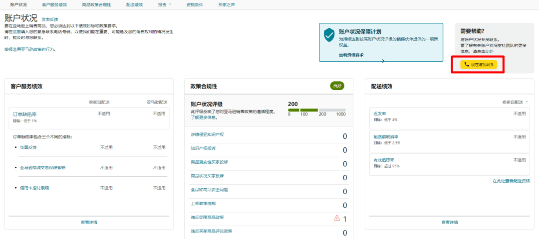 登录亚马逊卖家平台,点击“绩效 > 账户状况”,在页面右上角点击“现在与我联系”。