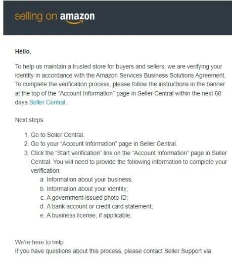 首先,卖家将会收到一封邮件(如下图),通知您开始验证卖家身份信息。