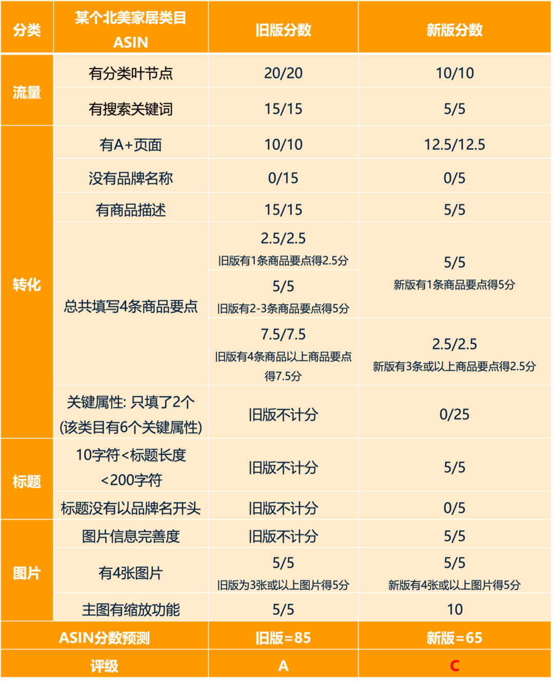假如您在北美站运营店铺,主营家居类目,那某个家居类ASIN在改版前后的分数就会有所不同。