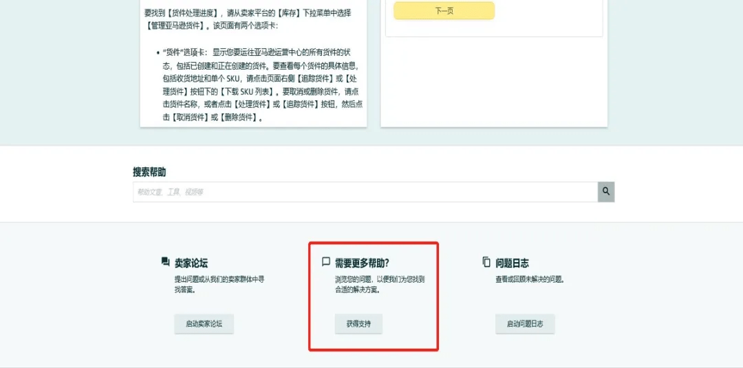 路径:亚马逊卖家平台右上角“帮助” >页面底部“获得支持”。