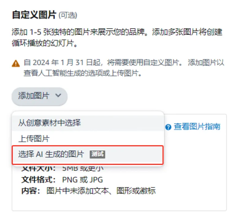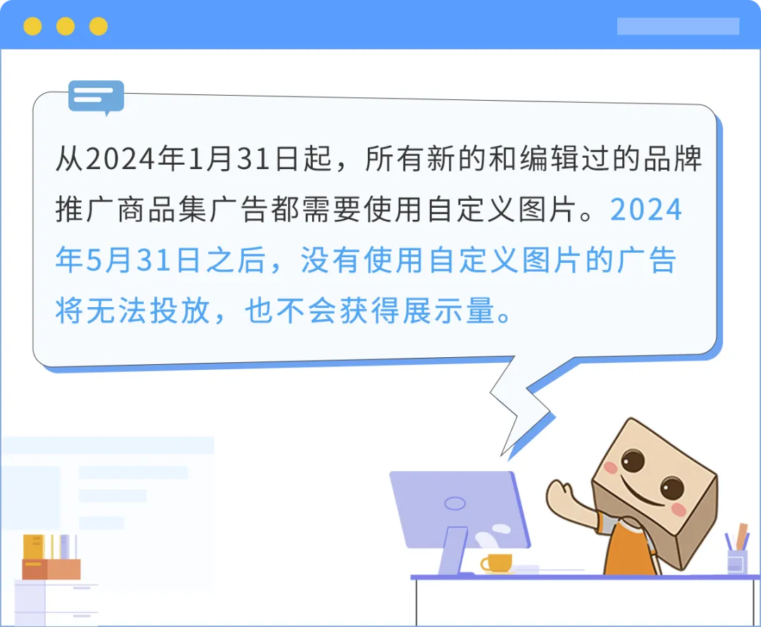 在过往的品牌推广商品集格式的广告投放过程中,亚马逊允许卖家投放仅使用商品图片的广告。从 2024年1月31日起,所有新的和编辑过的品牌推广商品集广告都需要使用自定义图片。2024年5月31日之后,没有使用自定义图片的广告将无法投放,也不会获得展示量。