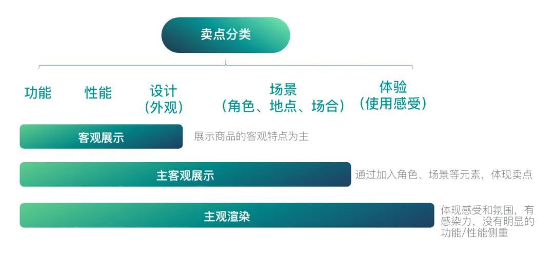 具体而言,客观展示以展示商品的客观特点为主;主客观展示需要加入角色、场景元素,让买家看到照片,就能产生代入感;主管渲染强调感受和氛围,没有明显的功能或性能侧重,但需要极具感染力。