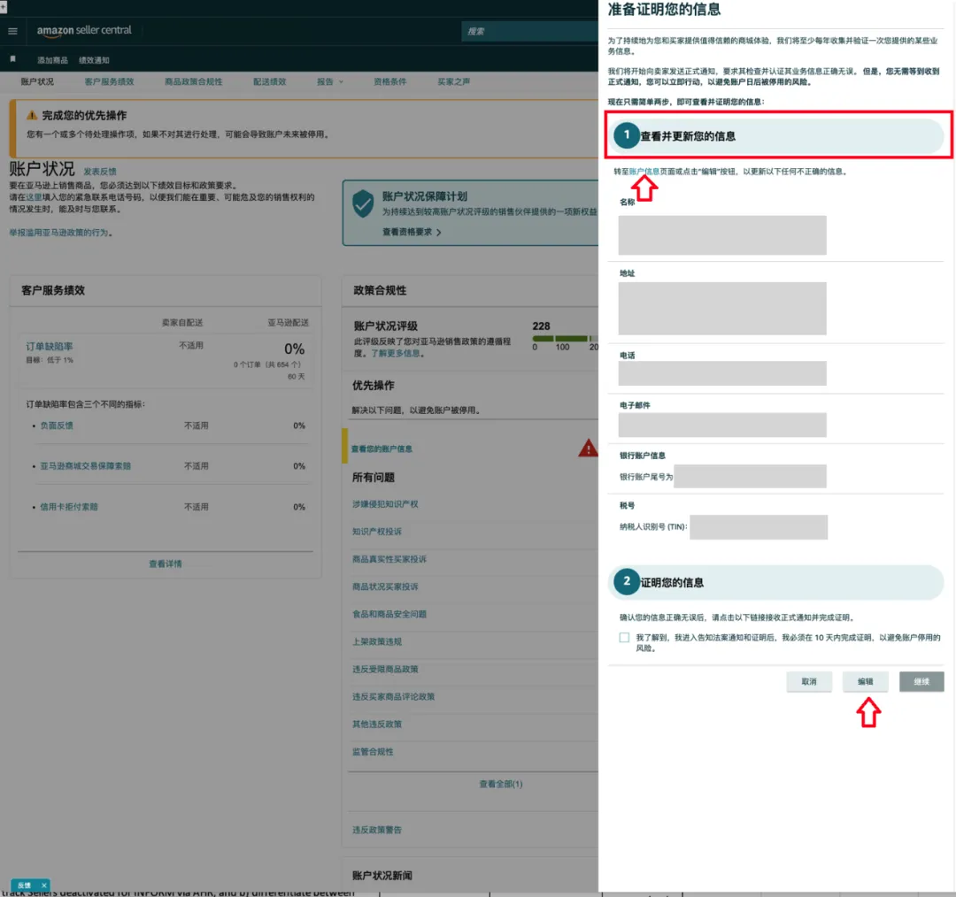 您在进入账户健康页面后,可以点击横幅右边的“解决问题”或“政策合规性”下方的“查看您的账户信息”按钮,进入信息认证页面之后,请检查所有信息的时效性和准确性。