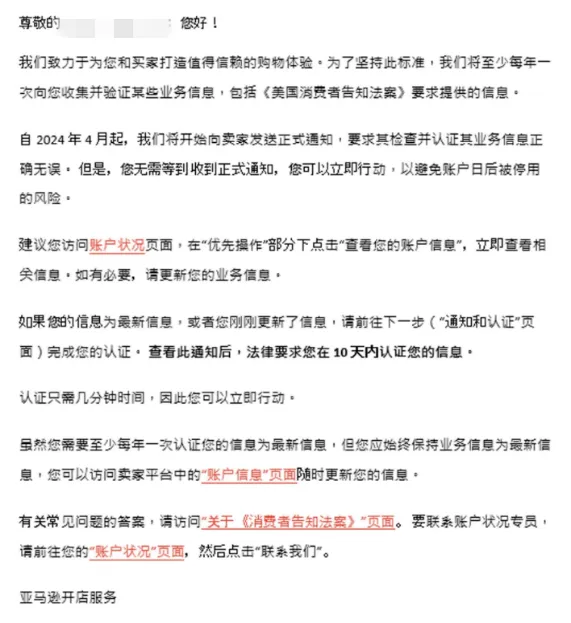 近期,亚马逊在陆续发送标题名为“[请求采取措施] 立即检查您的账户信息,以避免账户将来被停用”的邮件,给到去年6月27日前提交并验证通过了《美国消费者法案》所需五项信息的卖家,来提醒其完成2024年《美国消费者法案》年度认证,邮件内容建议卖家立即采取行动,以避免账户日后被停用的风险。