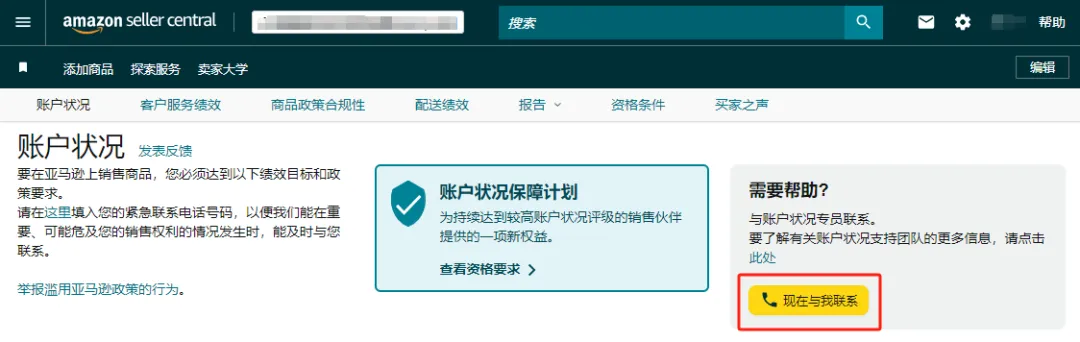 路径:登录亚马逊卖家平台 > 点击“绩效” > 点击“账户状况” > 在右上角点击“现在与我联系”。