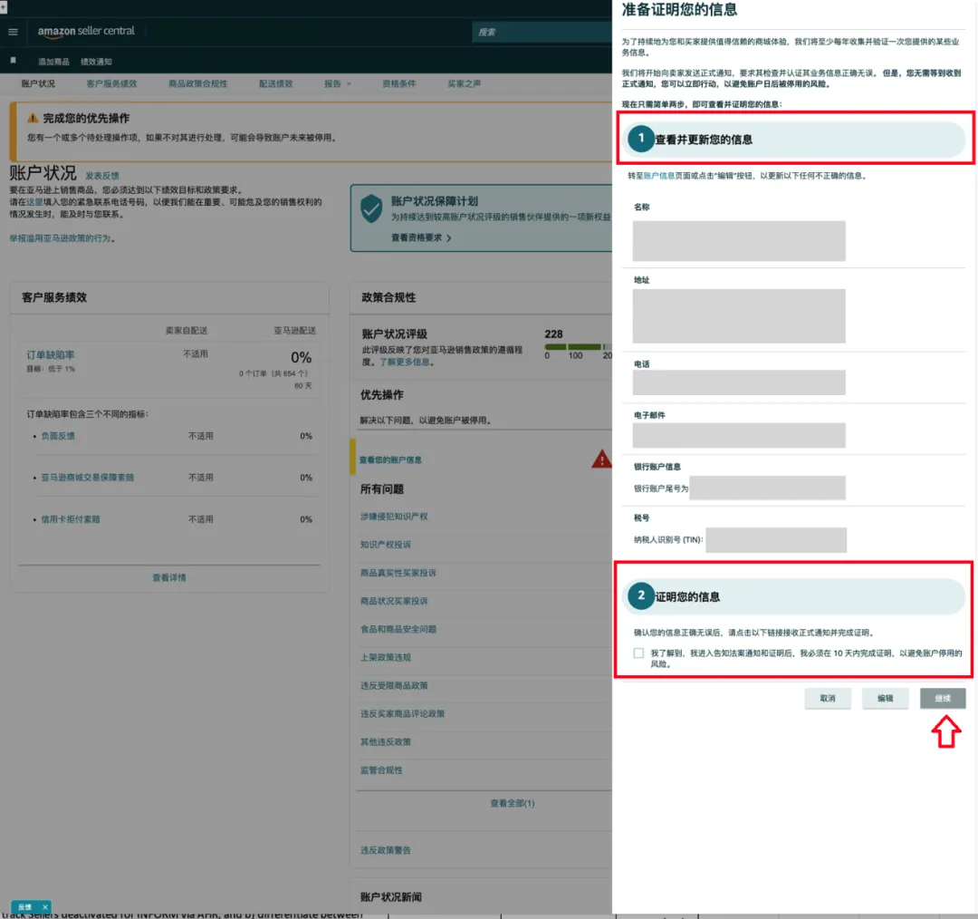请注意:点击“继续”按钮后,年度认证的流程将会开启,卖家必须在10天之内完成认证以避免对您的账户造成影响。点击“继续”后可再次确认所有信息的准确性,点击“证明”即可完成此次年度认证。