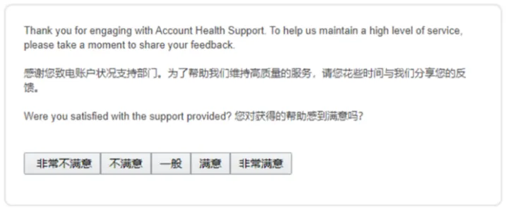 为了给卖家不断地提供高效服务,在通话结束后,您会在自己所注册的电子邮箱以及绩效通知里收到以下所示的问卷调查。亚马逊希望您可以留下宝贵的反馈,让账户状况支持团队持续进步且完善所提供的服务。感谢您持续的相伴与支持!