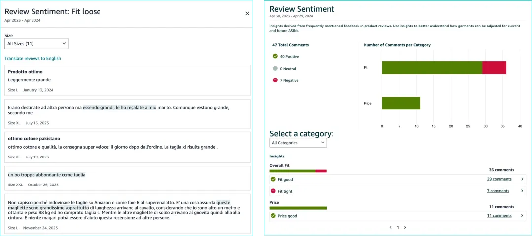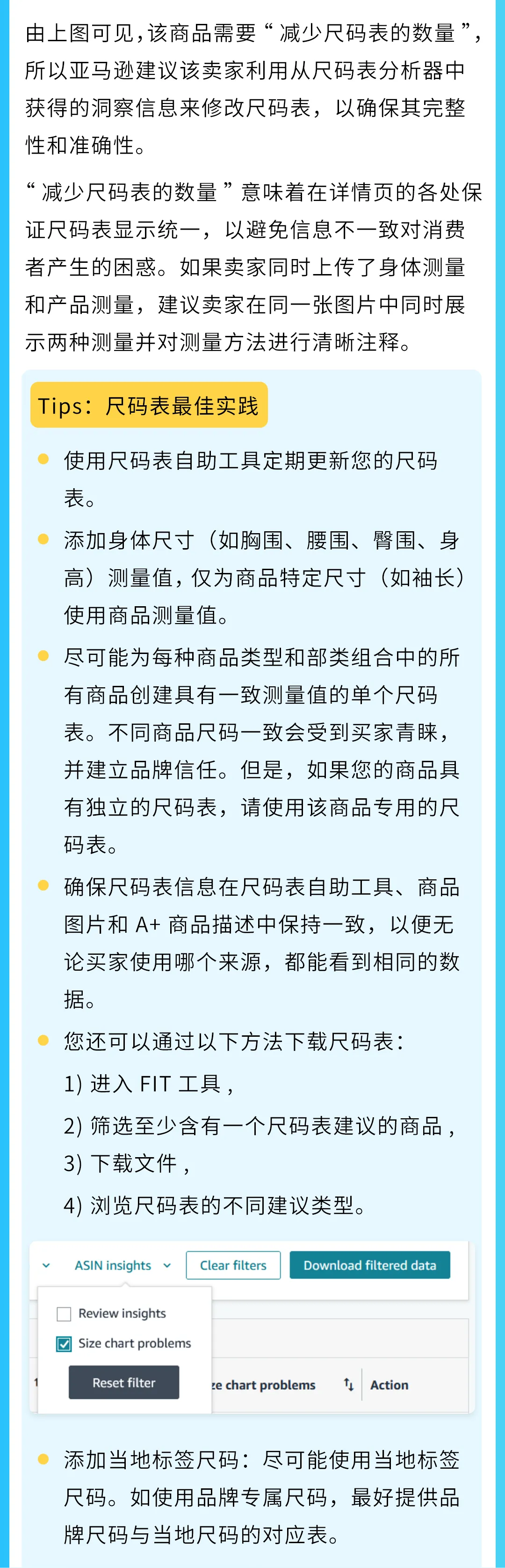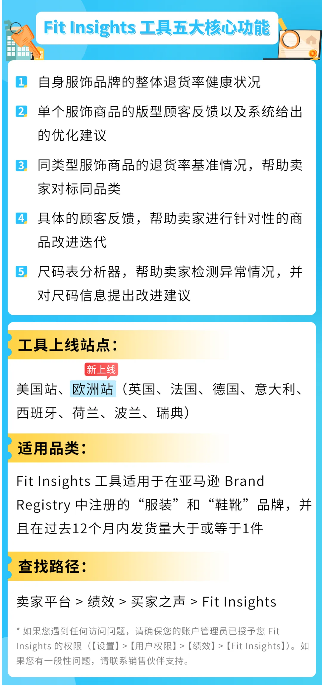 Fit Insights Tool(合身洞察工具)是一款由人工智能驱动的工具,它就像您的智能助手,通过对退货数据、尺码表,还有顾客对尺码、质量和价格的评价的快速抓取及分析,能够帮助卖家从父ASIN层级开始,定位不同尺码的尺寸和合身度问题,精准把握消费者对版型的需求。让消费者放心下单、买得合适,让卖家安心热卖,减少“售后之忧”!