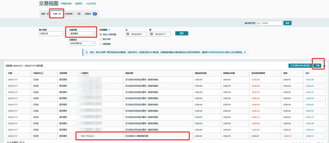 ● 付款控制面板 - 交易一览 - 交易类型(服务费用) - 点击更新,即可查看每个货件的入库配置服务费。