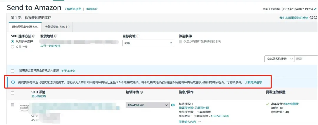 在第二步中,如果您的货件不满足亚马逊优化货件拆分的要求,页面也会给出提示如何调整才能符合要求