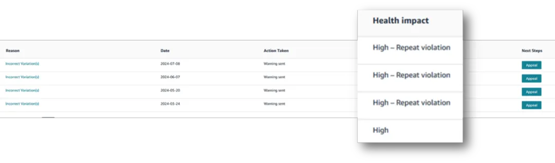 🔸 每次违反同一政策,您的账户状况评级中与该违反政策行为相关的分值都会增加。这意味着,反复违规会导致您的账户状况评级更快地被降级,反复出现严重程度更高的违反政策行为影响更大。为了帮助您识别和跟踪重复违规行为,以更快、更系统地解决问题,重复违规行为会在您的账户状况页面的“影响”栏中被标记。