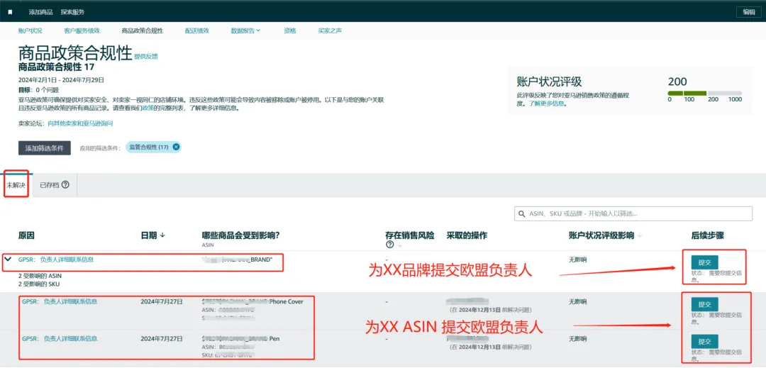 通用产品安全法规(GPSR)即将于今年12月13日正式生效,该法规影响绝大部分中国卖家,若您欧盟站点的监管合规页面(如下图)仍然有不合规ASIN提醒,小编强烈建议您尽快处理,完成合规,避免下架风险!