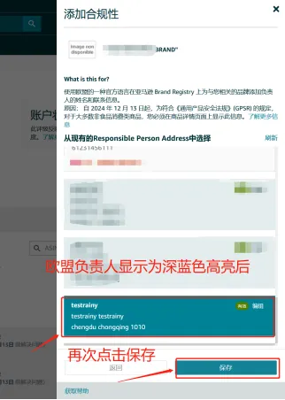 🔹 上传欧盟负责人信息成功之后,卖家需要选中信息并点击右下角保存,确保欧盟负责人显示深蓝色高亮(如下图)。