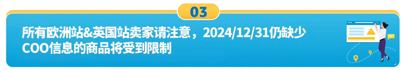 🔹 现有选品:如果您未在2024年12月31日前,对适用范围内所有现有商品提供原产国/原产地信息,则您的商品将受到限制,无法进出欧盟和英国。