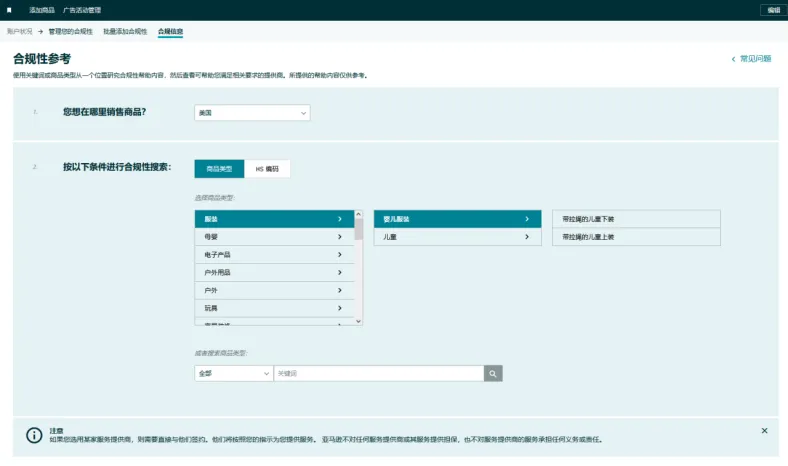 “管理您的合规性”工具还将新增“生产者责任延伸(EPR)”和“欧盟商品安全法规(GP)”等合规政策介绍,连接合规服务商网络集成,实现服务商线上沟通。
